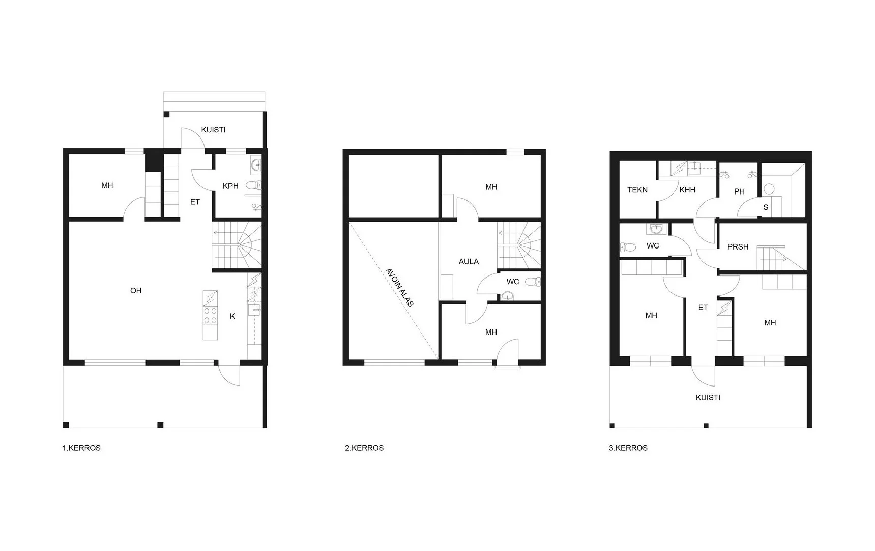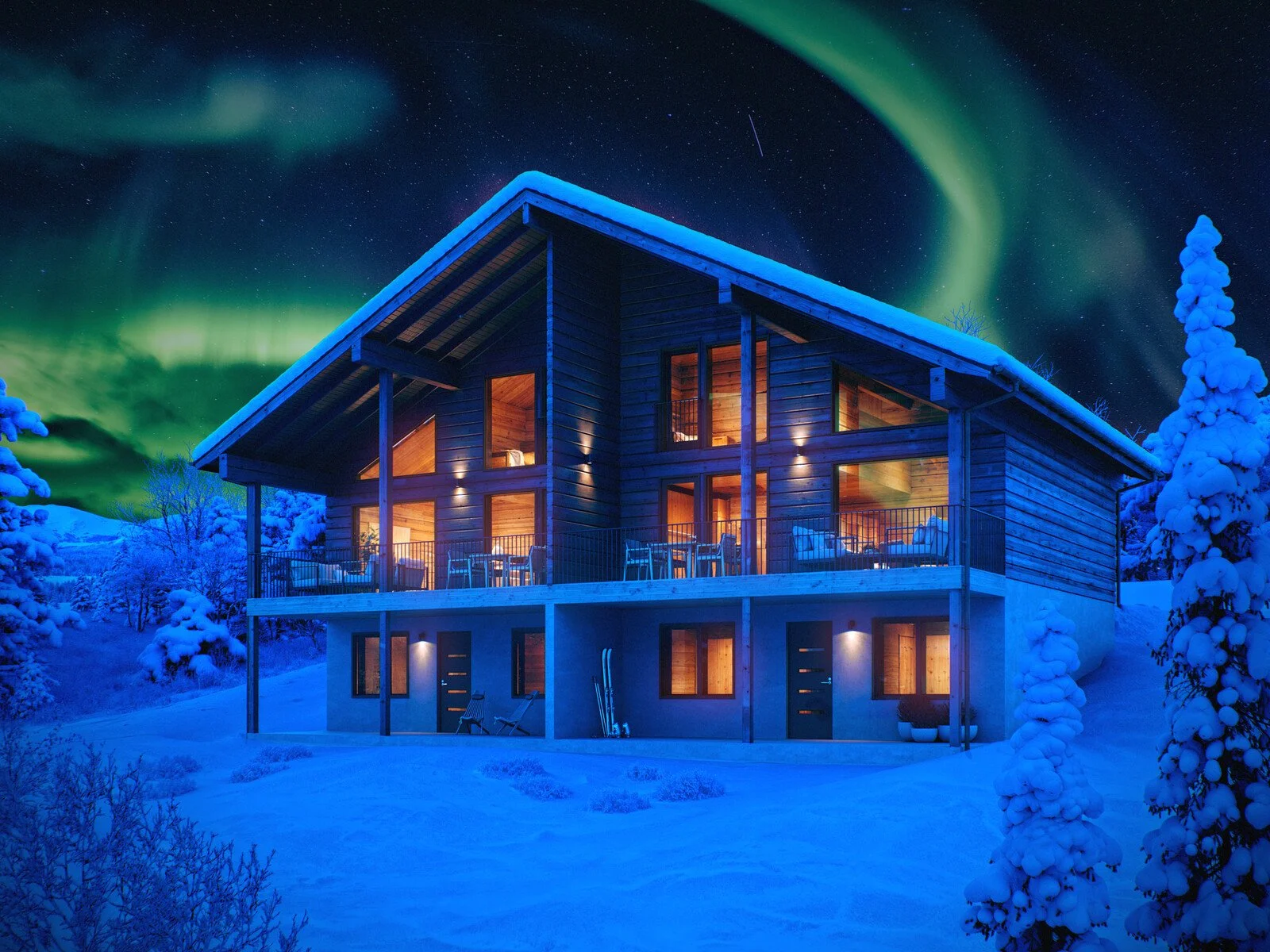 Alemmasta kerroksesta löytyvät sisäänkäynti ja käytännölliset huolto- ja varastotilat, ja ylin kerros tuo lisää tilaa oleskeluun ja majoittumiseen – suuret ikkunapinnat kehystävät Lapin maiseman osaksi elämyksellistä kokonaisuutta.