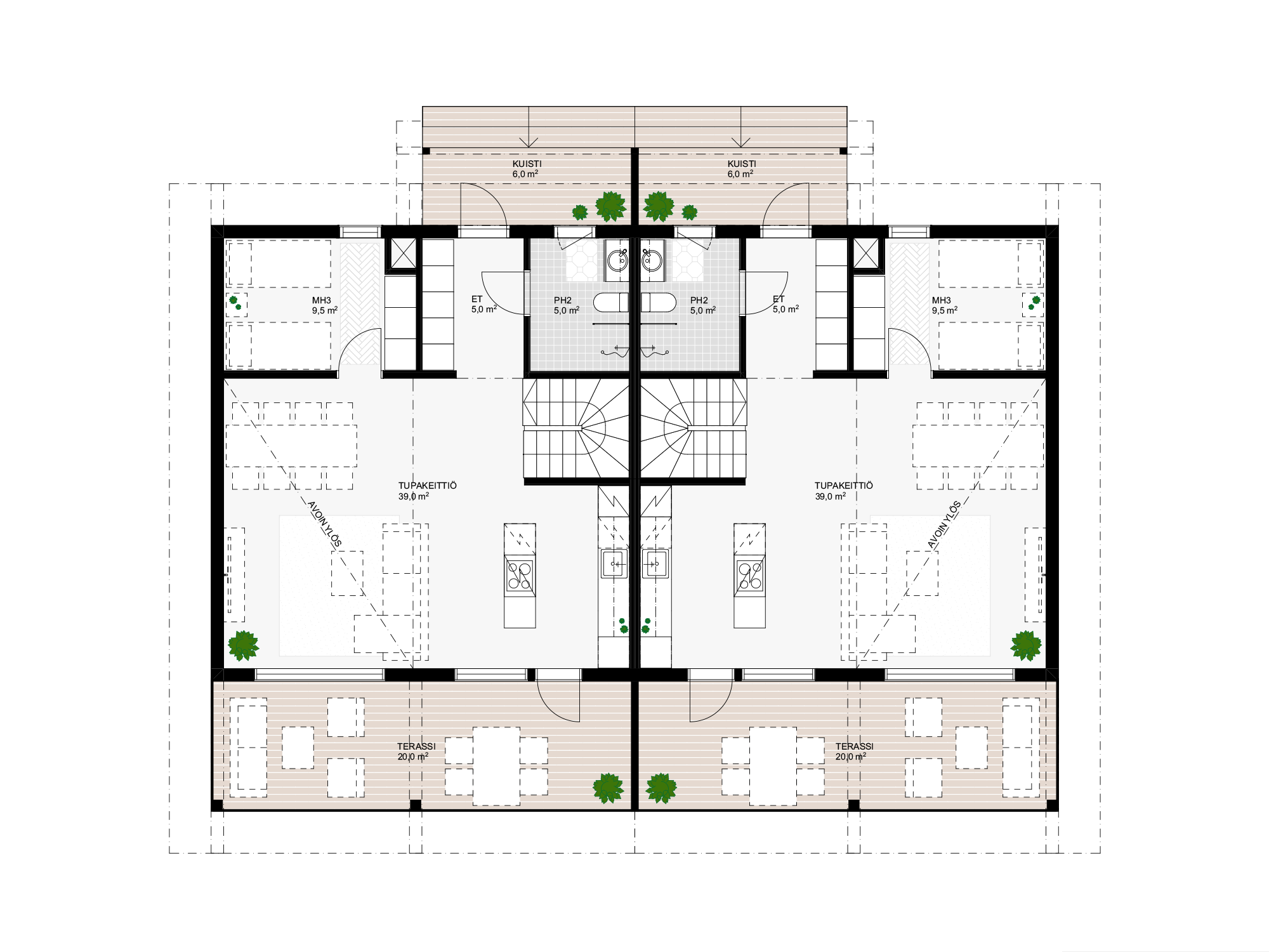 Voit valita pohjaratkaisuun sellaisenaan tai muuntaa siitä juuri sinun näköisesi. Suunnittelupalvelumme on tukenasi koko rakennusprojektin ajan aina ensisuunnitelmista valmiin talon viimeistelyyn.