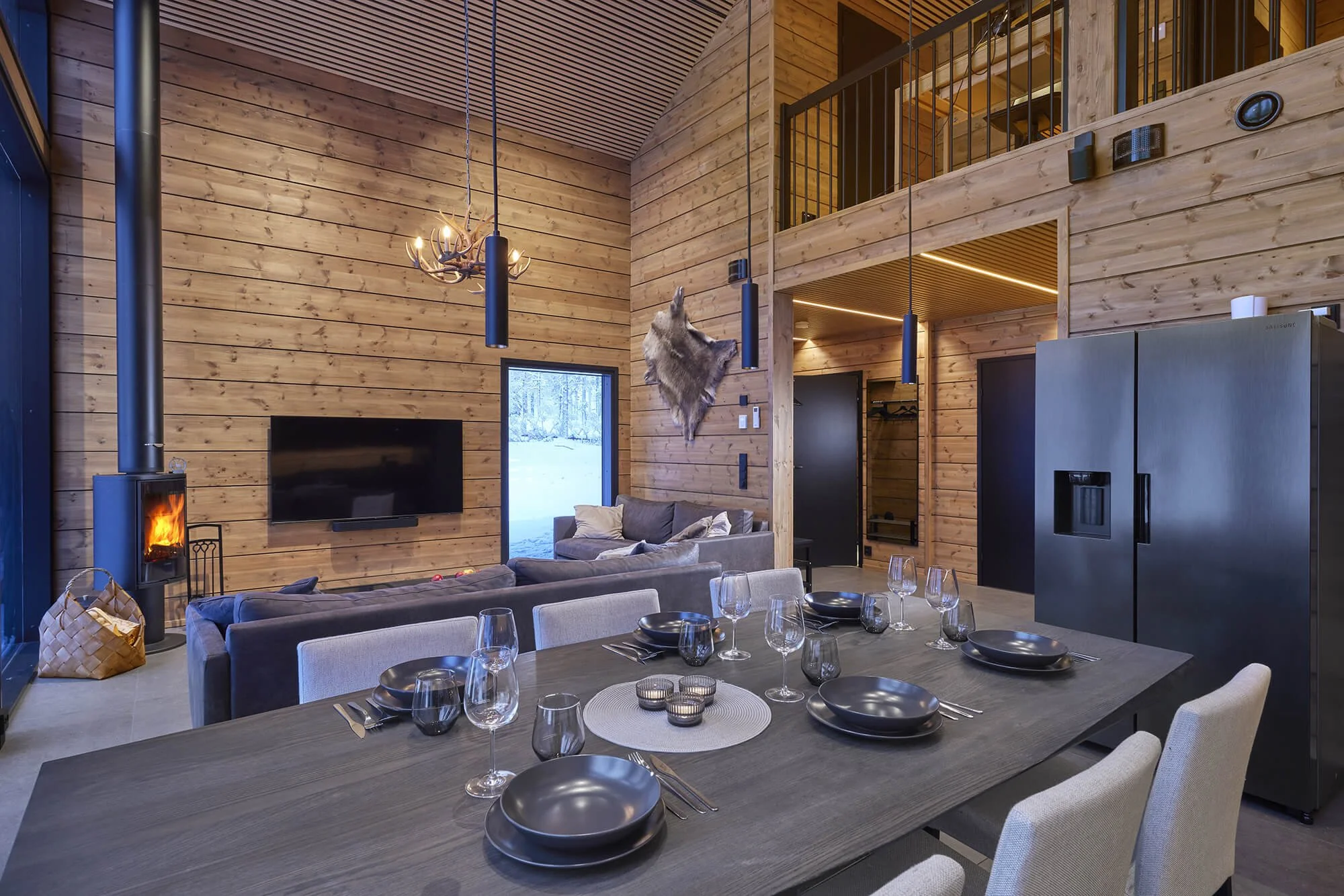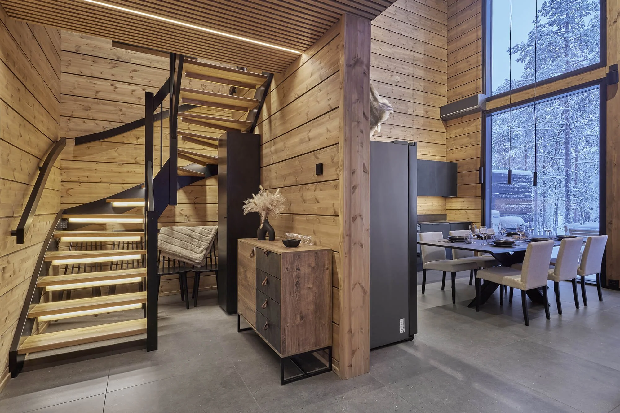 Alakerran tupakeittiö toimii kodin sydämenä. Avara oleskelutila avautuu suoraan terasseille ja kuisteille, tuoden maiseman ja luonnon luontevaksi osaksi arkea. Alakerrasta löytyvät myös makuuhuone, saunaosasto sekä erillinen wc, mikä tekee kokonaisuudesta toimivan ja helppokäyttöisen.