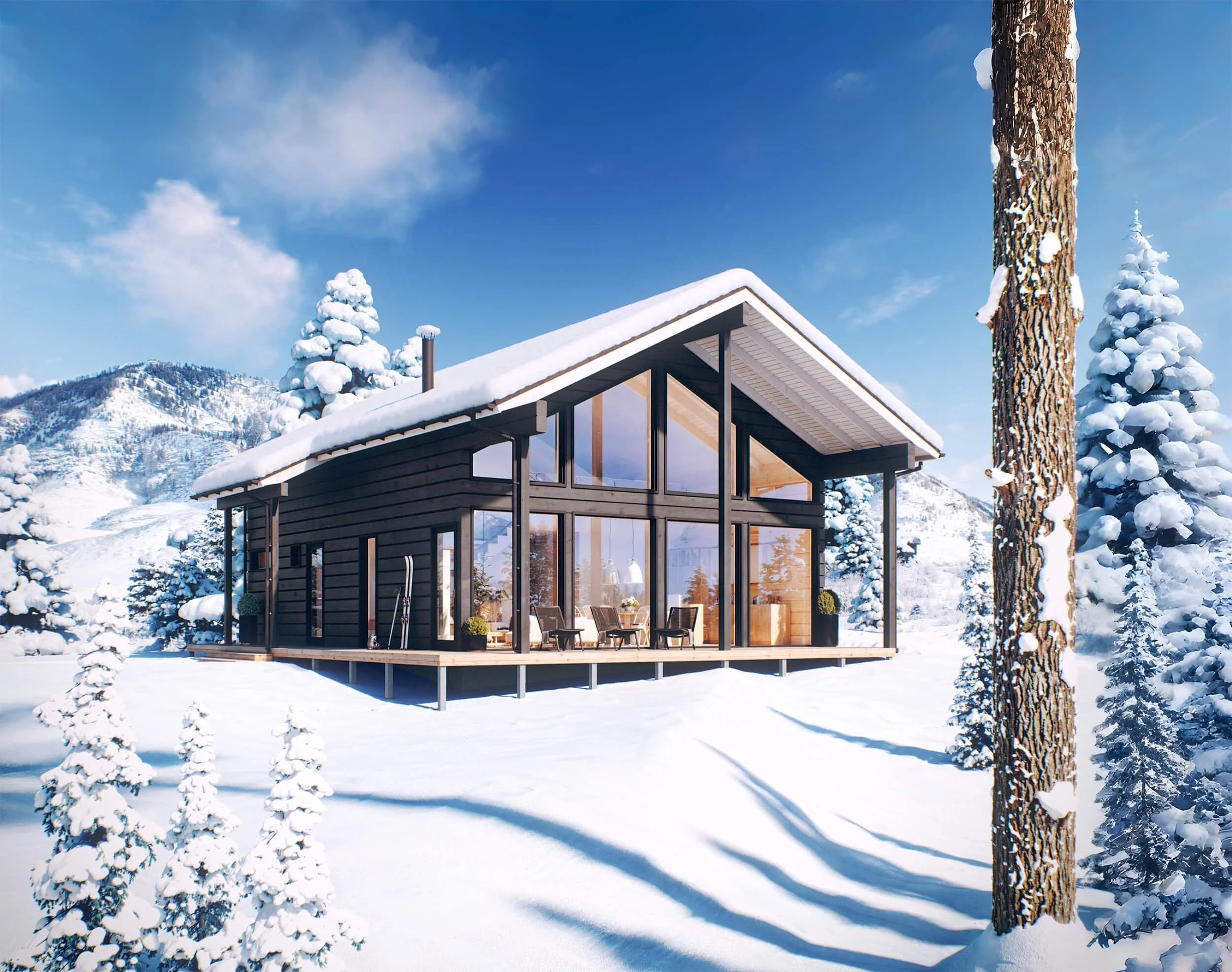 Laaja terassi jatkaa oleskelutilaa ulos ja tarjoaa suojaisan paikan nauttia luonnosta ympäri vuoden. Kokonaisuus yhdistää modernin arkkitehtuurin, luonnonläheiset materiaalit ja tilan, joka tuntuu avaralta mutta samalla kodikkaalta.